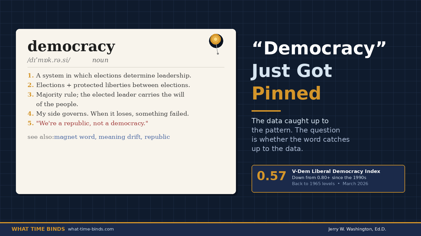 The V-Dem report is a Repair Activation event. A research institute spoke the first sentence. They said: by our measurement, using these criteria, this word no longer means what most Americans assume it means when they use it.