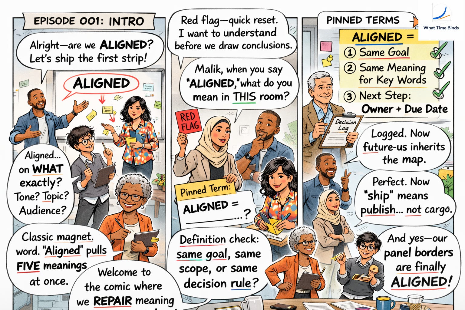“Aligned” is a magnet word. People nod while hearing different contracts: goal, scope, definitions, next step, and permission. The fix is simple: pin the term to one meaning in this room, then log it so future-us inherits the map.