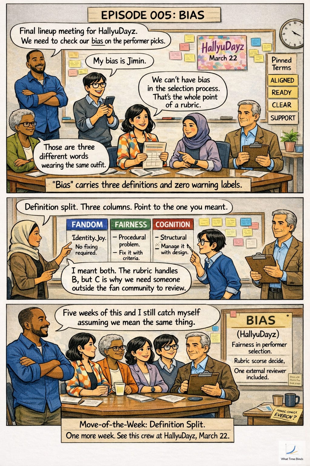 “Bias” is a magnet word — and this week it carried three completely different payloads into the same room. One person meant their favorite KPop member (a term of affection). Another meant unfair preference in a decision (a procedural flaw to correct). A third meant cognitive distortion (a structural problem to design around). Same six letters. Three galaxies of meaning. The room agrees to “check our bias” and immediately splits into three separate conversations.