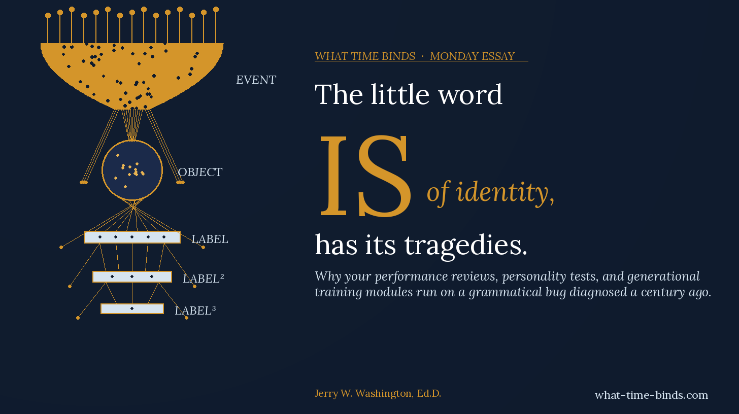 In 1923, George Santayana wrote that “the little word ‘is’ has its tragedies: it marries and identifies different things with the greatest innocence; and yet no two are ever identical.” A hundred and three years later, most leadership coaching, DEI workshops, generational training, and performance review calibrations still haven’t fixed what he diagnosed. A single three-letter verb quietly collapses the distance between what a person does and who a person supposedly is, and every org chart, every 360, every “he’s just not a team player” comment rides that collapse downhill into decisions that harden and compound.