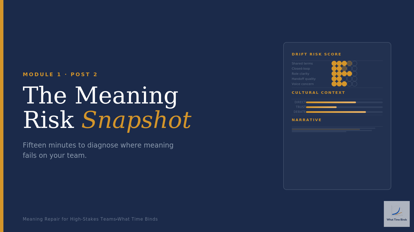 This is Module 1, Post 2 of Meaning Repair for High-Stakes Teams, a 10-module course on the What Time Binds Substack. The complete Meaning Repair Lexicon defines every term used in this course.